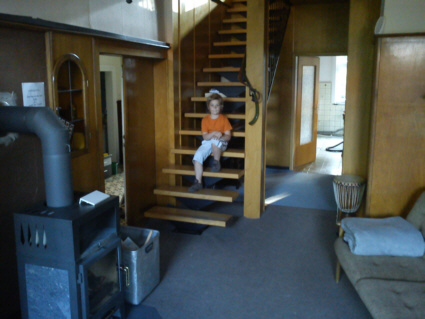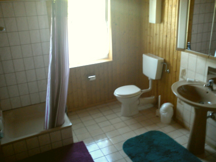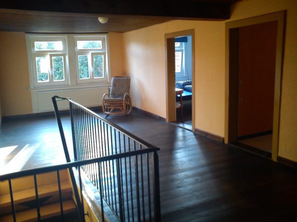 Die große Wohnung hat ca. 233 m². Im Untergeschoss sind die große Küche, der Wohnflur mit dem Kaminofen, das große Wohnzimmer und ein Schlafzimmer. Im Obergeschoss befinden sich vier weitere Schlafzimmer und das Bad.