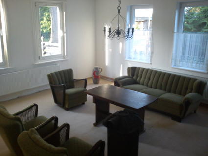 Gleich hinter der Küche gibt es einen Wohnflur, indem es sich am Kaminofen abends gemütlich machen lässt. Gleich daran schließt sich die große Wohnstube an, die ebenfalls viel Platz für gesellige Runden bietet.