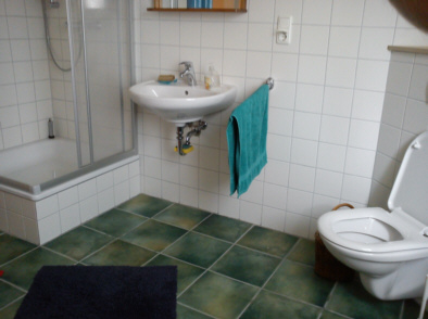 Das Bad (10,6m²) hat eine Dusche, ein Waschbecken und ein WC.